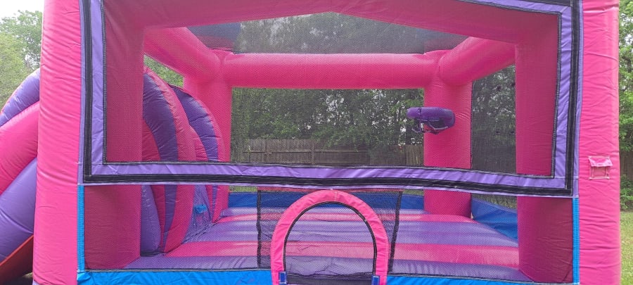 5 In 1 Princes Bounce House with Slide Combo, features a large bouncing area, climb wall, basketball hoop, slide and tunnel.Pool is an inflatable landing pool.