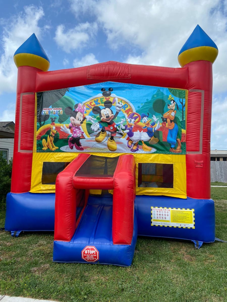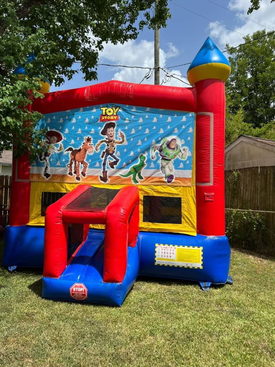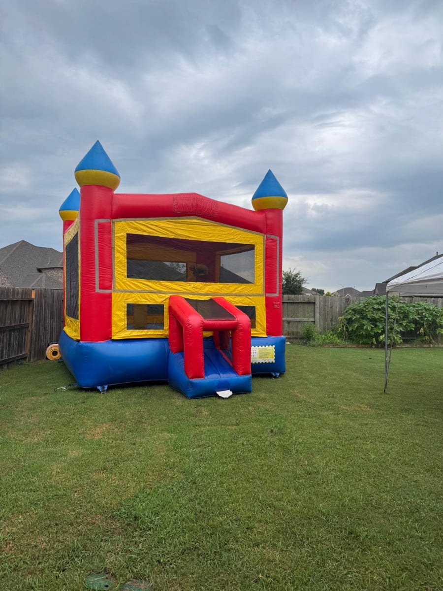 13X13 RED AND YELLOW MOONWALK WITH BASKETBALL HOOP INSIDE AND 2 TOWERS TO PLAY WITH,THIS UNIT WILL SURELY HAVE CHILDREN ENTERTAINED WHILE YOU SIT BACK AND RELAX AND ENJOY THE DAY AWAY!