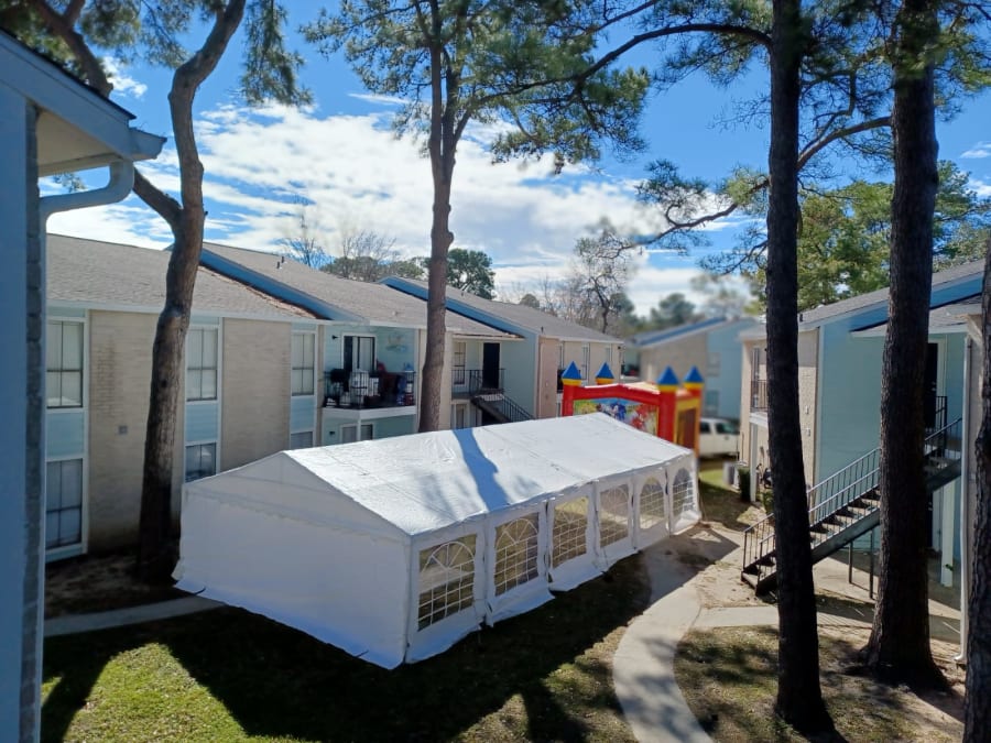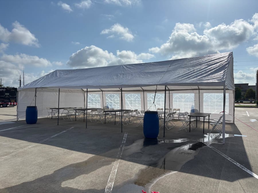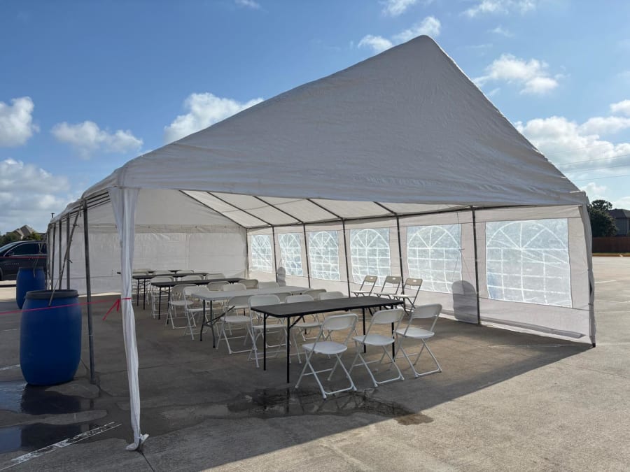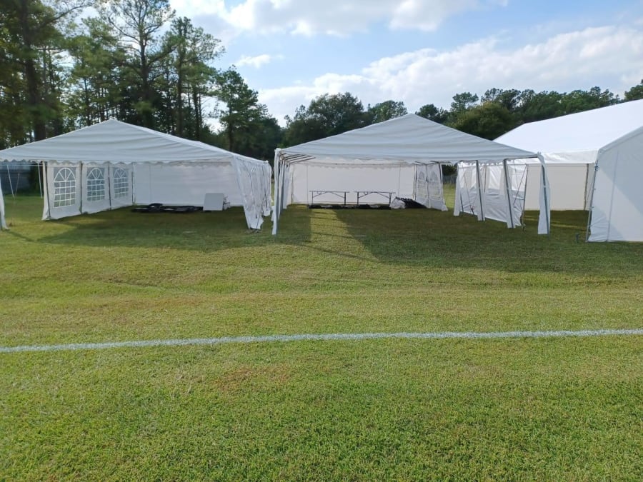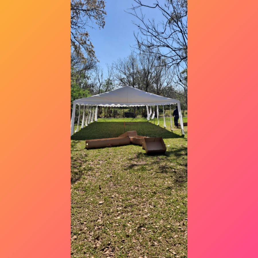 20X40 TENT THAT HOLDS UP TO 100 GUESTS ,VERY LARGE TENT THAT FITS COMFORTABLY UP TO 12, 6FT RECTANGULAR TABLES WITH CHAIRS AND 1 MAIN DECORATION TABLE.